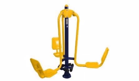 Equipamento de ginástica para Academia ao Ar Livre/ Academia da Terceira Idade ATI. Fabricado com tubos de aço carbono de no mínimo 4" x 3 mm; 3 ½" x 3,75; 2" x 2 mm; 2" x 3 mm; Chapas de aço carbono de no mínimo 4,75 mm para reforço de estrutura do equipamento e 2 mm para banco e encosto com dimensões de 335 mm x 315 mm e estampados com bordas arredondadas. Tubo de aço carbono trefilado 2" x 5,50 mm SCHEDULE 80 (60,30 mm x 49,22 mm). Utiliza-se pinos maciços, todos rolamentados (rolamentos duplos), tratamento de superfície a base de fosfato; película protetiva de resina de poliester termo-endurecível colorido com sistema de deposição de pó eletrostático, batentes redondos de borracha flexível (53mm x 30mm), solda mig. Chumbador com flange de no mínimo 230 mm x 3/16", com parafusos de fixação e arruela, hastes de ferro maciço trefilado de no mínimo 3/8", parafusos, arruelas e porcas fixadoras; acabamentos em plástico injetado e/ou emborrachado. Adesivo refletivo destrutivo com identificação dos grupos musculares.